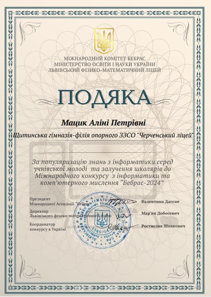 З радістю оголошуємо результати цьогорічного міжнародного конкурсу з інформатики та комп’ютерної грамотності “Бебрас-2024”, у якому взяли участь учні Щитинської гімназії-філії ОЗЗСО "Черченський ліцей", які продемонстрували високий рівень знань, логіки та нестандартного мислення.